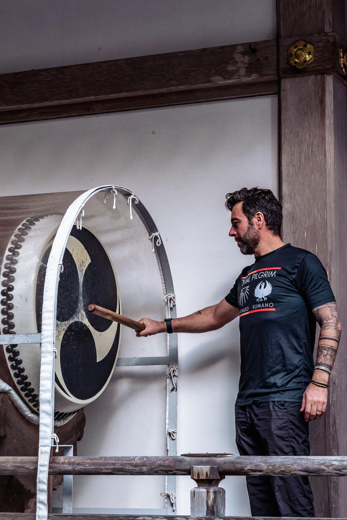 Receber esse título no Japão tem um toque especial, pois o templo Xintoísta onde finalizamos a nossa rota da Expedição Japão com Kumano Kodo, oferece uma experiência única para os peregrinos duplos [dual pilgrims]: A cerimônia do Taiko sagrado. Após receber o certificado de peregrino duplo, temos a honra de subir no altar do santuário e para tocar o taiko em agradecimento à vivência singular que é viver as duas peregrinações mais importantes do mundo, uma em cada canto do globo.