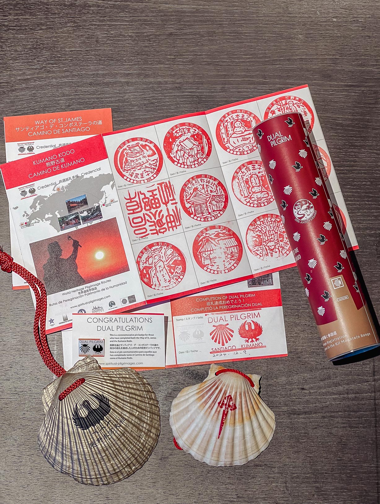 Após concluir ambos os caminhos, você deve se registrar oficialmente no programa Dual Pilgrim, apresentando seu certificado de compostela, ou a credencial de peregrino com o carimbo final de Compostela + a credencial de Kumano Kodo, também com o carimbo final da rota realizada.